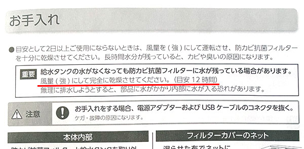 寝ているだけで動かないのがいいのか、風量は「弱」で十分でした。僕の環境下ではタンクの水が6割ほどあれば、朝まで持ちますし(大体7時間前後くらいでしょうか)。